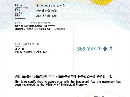 순성길 문화예술 축제 〈369 성곽여가 풍;류〉의 상표 특허권이 출원되었습니다. 〈369 성곽여가 풍;류〉는 한양도성 순성길 낙산 구간에 위치한 369성곽마을 성곽길 일…
